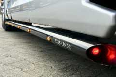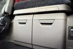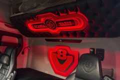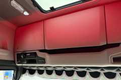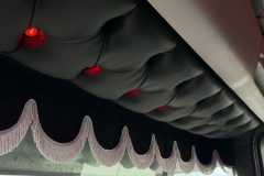 Ramy z lampami ze stali nierdzewnej LightFix (boki, góra i tył kabiny), oświetlenie zewnętrzne w kolorze pomarańczowym, podświetlane logo SCANIA, emblematy, światła led, światła na zabudowie międzyosiowej i bocznych spojlerach, koguty ledowe. Kierownica w stylu retro. Oświetlenie wewnętrzne podświetlane logo na ścianie kabiny, pikowana tapicerka