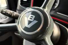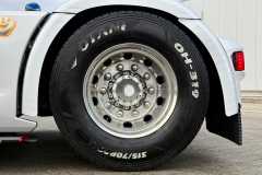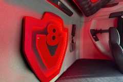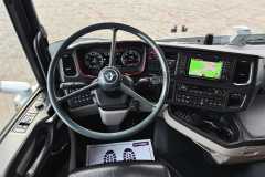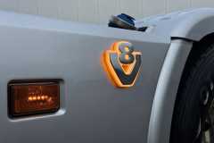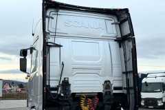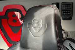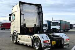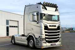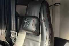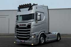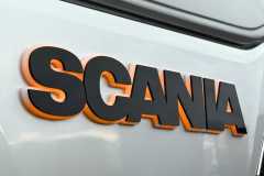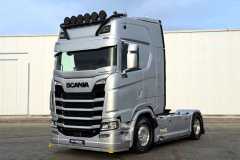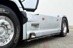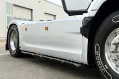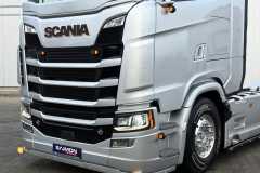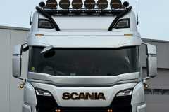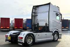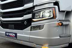 LightFix stainless steel frames with lamps (sides, top, and rear of the cab), orange exterior lighting, illuminated SCANIA logo, emblems, LED lights, and tail lights The mid-axle bodywork and side spoilers, LED rotating beacons, a retro-style steering wheel, interior lighting, and an illuminated logo on the cabin wall, are quilted upholstery.